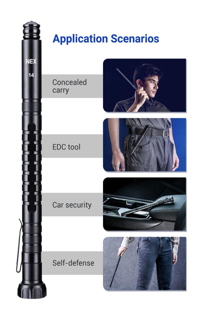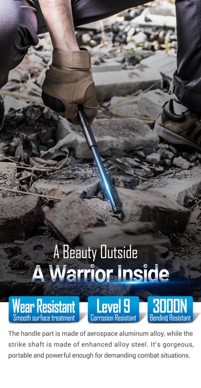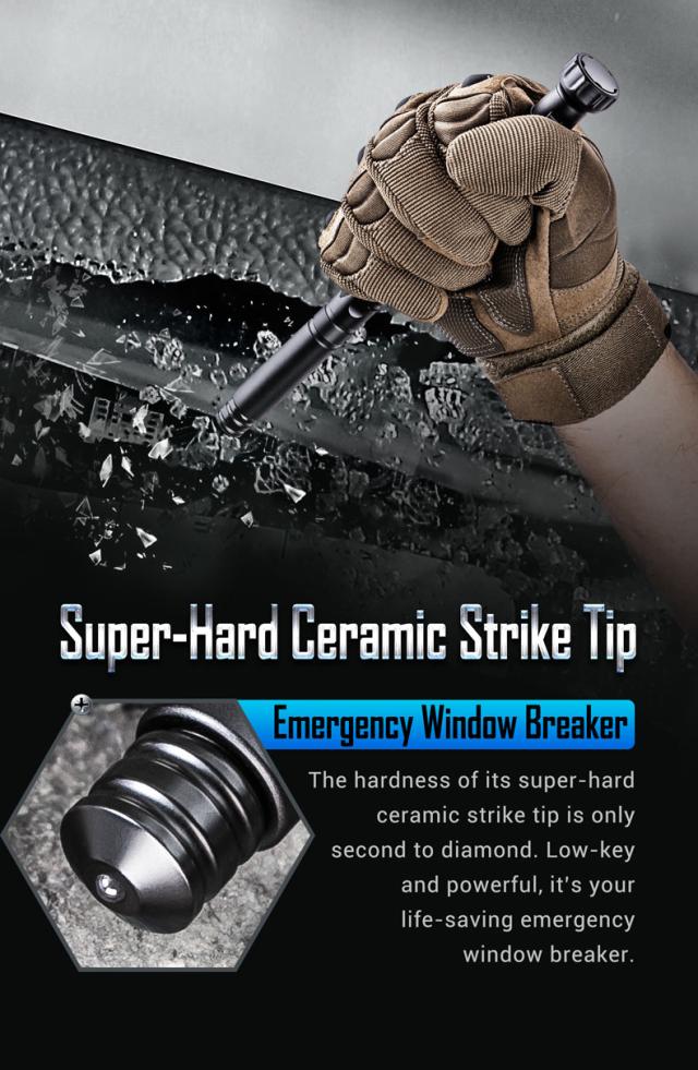 バトンの鋼材には7075T6アルミ合金と4140鋼を使用したエアウエイト型。先端チップには 緊急時に窓ガラスを割るためにナノセラミックが埋め込まれています。NEXTORCHのバトンは他の中国製のコピーバトンとは「一線を画す」ものであるのはもちろんのこと、メジャーブランドのバトンにも引けを取らない品質が備わっています。