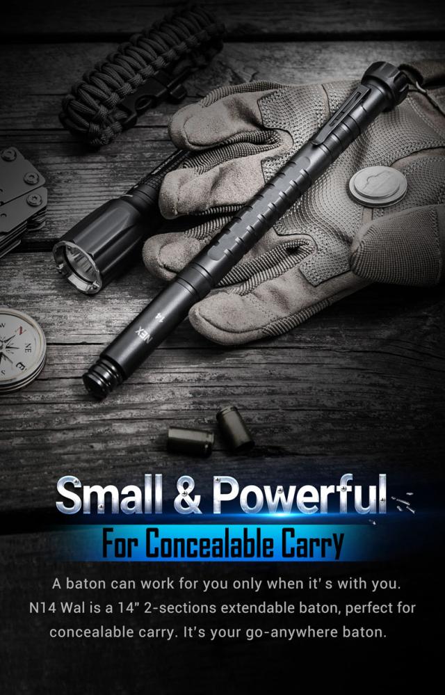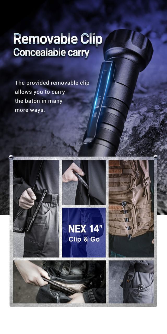 N14WALバトンはNEXシリーズでは唯一の2段式バトンで、全長は約35.6cmの長さを持つオートロックバトンになります。重量も157gと軽量なので持ち運びの負担になりません。隠し持つことを容易にし、クランプ(クリップ)は取り外すことも位置を変えることも可能となっています。