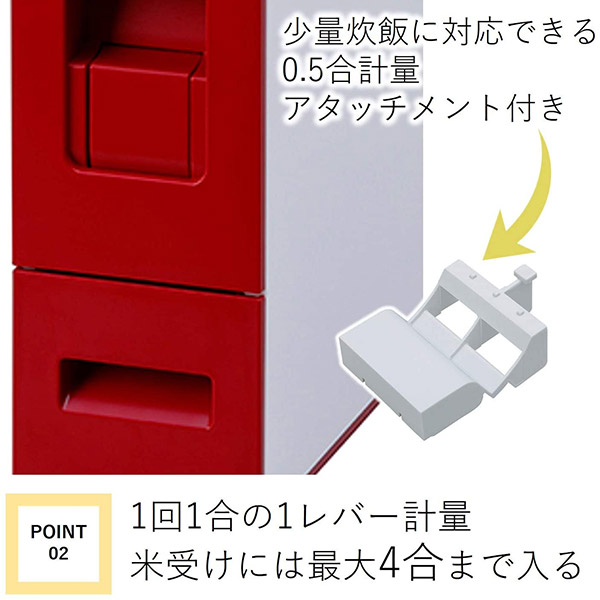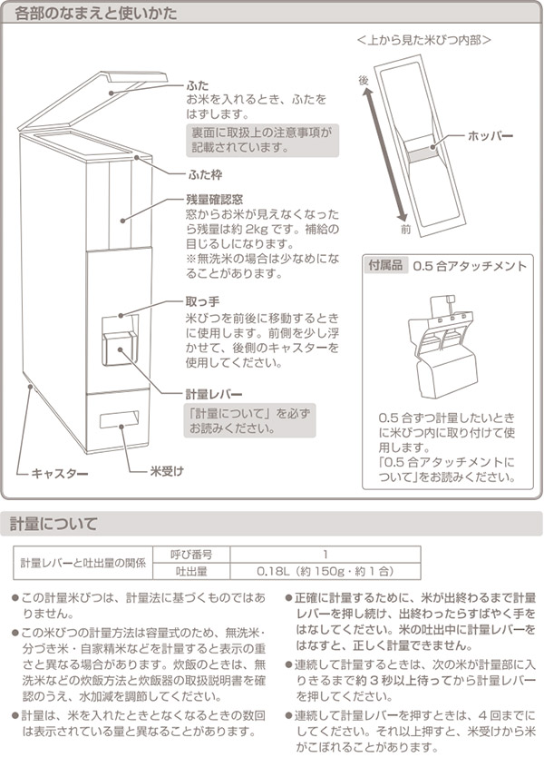 材質:本体/鋼板(樹脂焼付塗装)、ふた 米受け 計量部 残量確認窓/ポリスチレン、