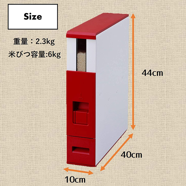 米びつ容量は白米6kg。本体はサビ、腐食に強い樹脂焼付塗装。