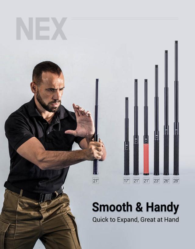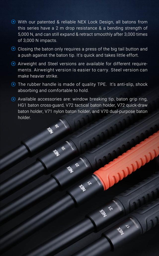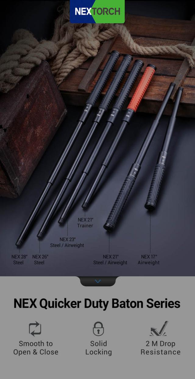 NEXTORCHのバトンには独自のロック機構(NexLock)が採用されています。殆どの中国メーカーがASPのTALONを真似てオートロックバトンを製作するのに対してNexLockは、他では見られないシンプルな構造でオートロックバトンを仕上げています。特許侵害に触れない為、欧米にも輸出が可能です。国際入札にもメジャーブランドと共に参加している数少ないオートロックバトンメーカーになります。とりわけ4140鋼を使用したスチールバトンは警棒の試験では最も難しいと言われるTR試験にも合格しています。そのため世界の軍事市場でも人気があるバトンです。近年ではルーマニアやドイツ軍にも納入された実績があります。
