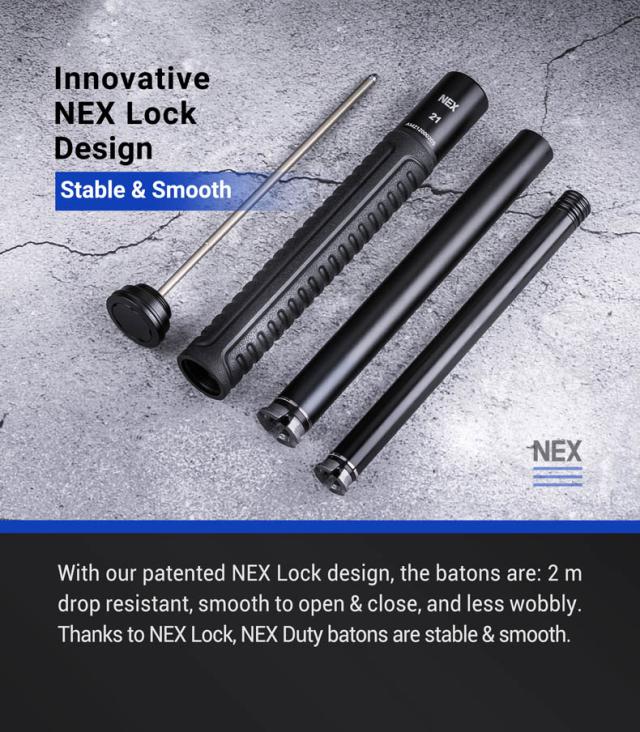 NEXLOCKは誰でも簡単にバラしたり組み立てたりが可能で、中身が分かり易くメンテナンスが楽な構造とも言えます(動画をご参照ください)。2mの落下試験にも合格する耐衝撃強度も兼ね備えていて、バトンはガタツキも少なくスムースな開閉は取り扱いを容易にします。