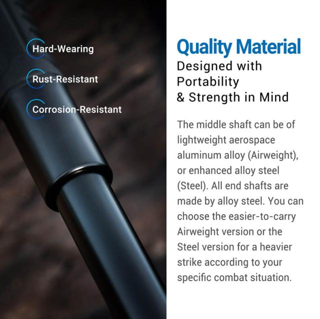 バトンの鋼材にはクロ—ムモリブデンのみを使用したスチール型。TPEラバーグリップは滑りにくく確かなグリップ力を約束します。さらにオプションのグリップリングを取り付ければスッポ抜け防止や相手がバトンを掴んだ時にも奪われにくくなります。先端チップには通常のフラットタイプが使用されていますが、オプションでナノセラミックが埋め込まれたブレイキングチップ(BT50002)を取り付けることも可能です。ブレイクキングチップは緊急時に窓ガラスを割るためのクラッシャーになります。