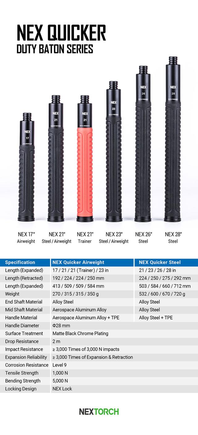 NEXTORCHのバトンには独自のロック機構(NexLock)が採用されています。殆どの中国メーカーがASPのTALONを真似てオートロックバトンを製作するのに対してNexLockは、他では見られないシンプルな構造でオートロックバトンを仕上げています。特許侵害に触れない為、欧米にも輸出が可能です。国際入札にもメジャーブランドと共に参加している数少ないオートロックバトンメーカーになります。とりわけ4140鋼を使用したスチールバトンは警棒の試験では最も難しいと言われるTR試験にも合格しています。そのため世界の軍事市場でも人気があるバトンです。近年ではルーマニアやドイツ軍にも納入された実績があります。