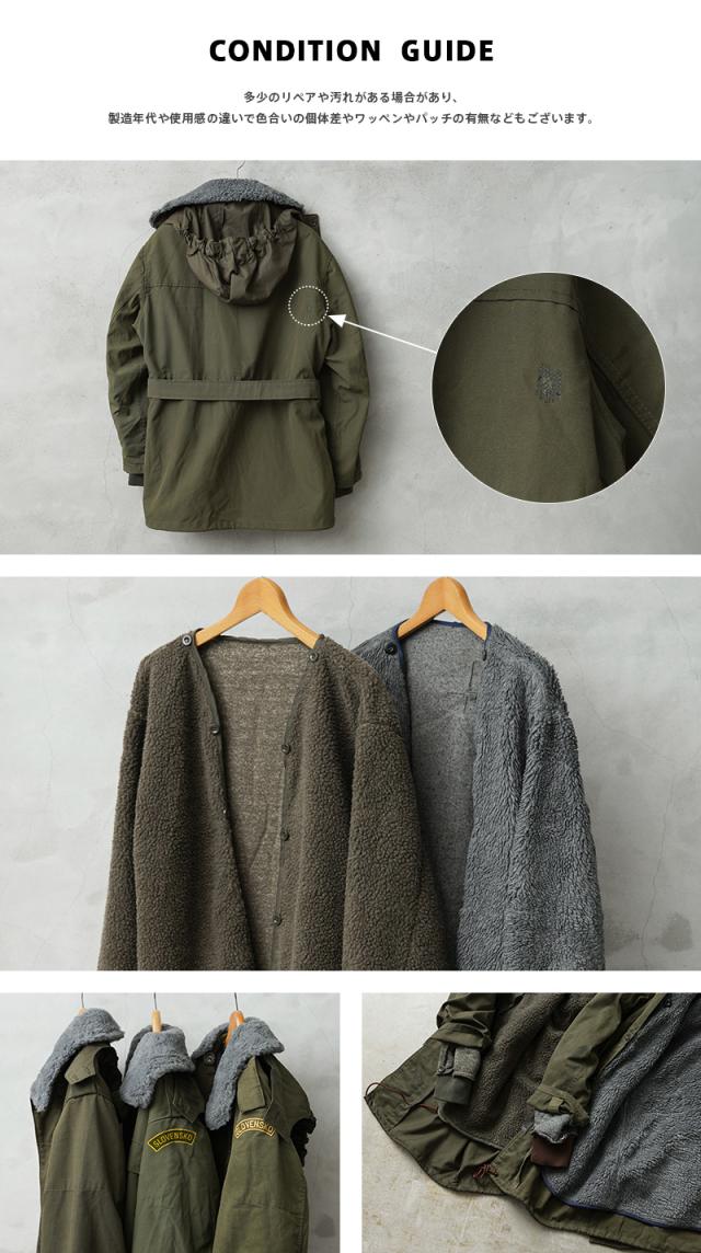 ※多少の汚れや傷、リペア跡、ドローコードが内蔵されていない場合やライナーを取り付けるボタンに一部欠損がある場合がございます。USEDの味としてとらえていただける範囲の物をセレクトしています。また、製造年代や使用感の違いで色合いの個体差やワッペンやパッチの有無などもございます。肩のボタンのデザイン違い、胸にベルクロパネルが付いる等の個体差がございます。ライナーに関しても時期により様々なカラーが存在するようです。商品の状態についてご指定いただくことは出来ませんので予めご了承ください。