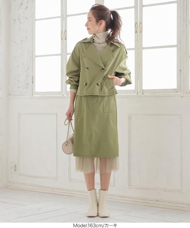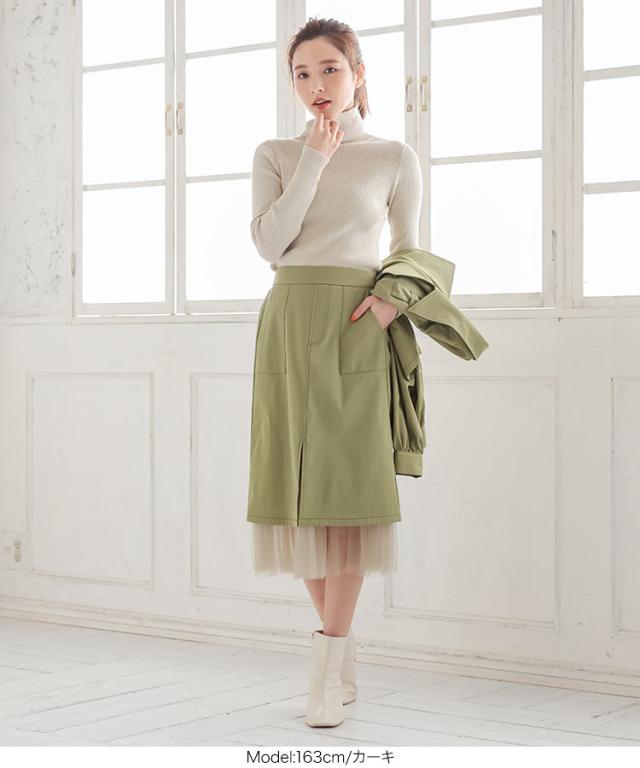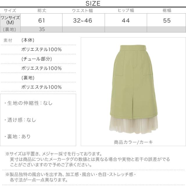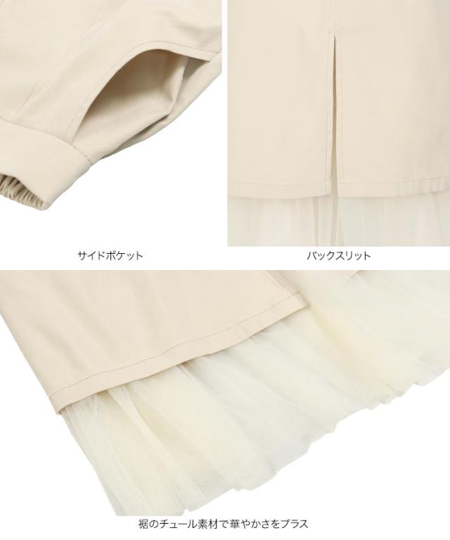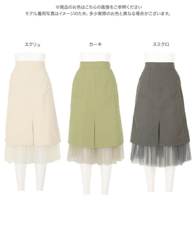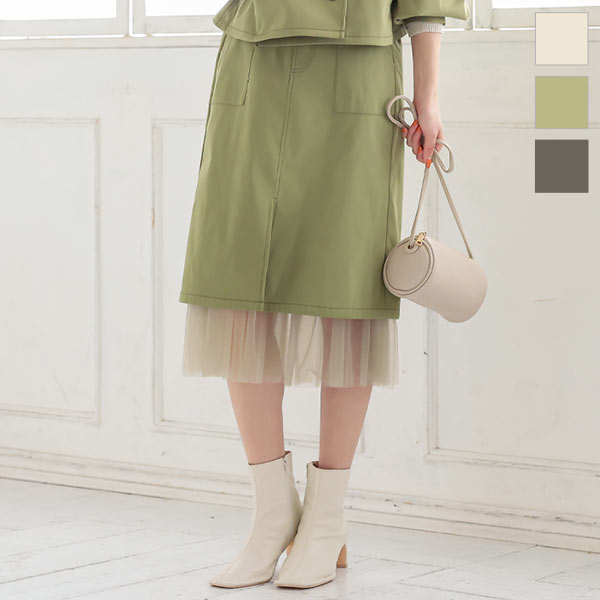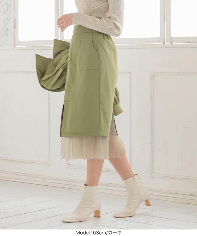 春新作 裾チュールステッチスカート M3196 入荷済 レディース スカート チュール ウエストゴム 大人 ゆったり 春 ミモレ丈 セットアップ レイヤード チュールスカート スリット ベイカー ポケット エクリュ カーキ 黒 40代 50代