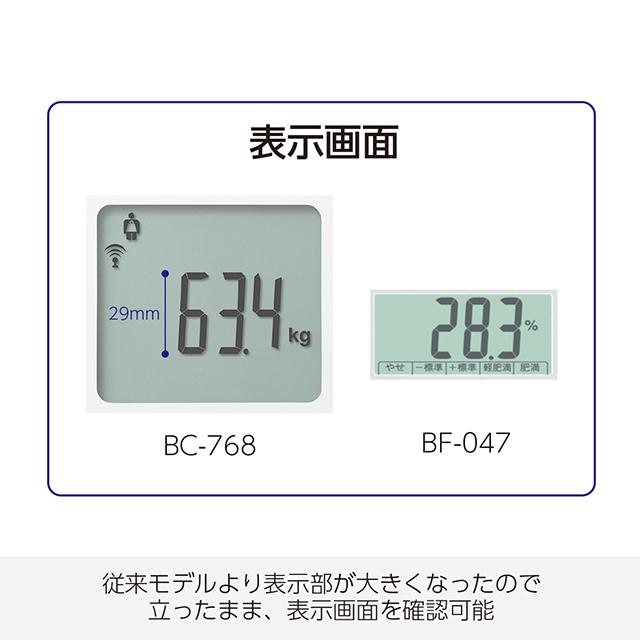 商品名 タニタ 体組成計 BC-768 メーカー タニタ メーカー型番 BC-768WH、BC-768BK カラー パールホワイト、メタリックブラック メーカー保証期間 1年 本体サイズ 幅 316mm × 高さ 27mm × 奥行 217mm 本体重量 約 1.5kg(乾電池含む) 付属品 取扱説明書(保証書付)、お試し用電池(単4形アルカリ乾電池(LR03)×4本) 計量範囲 0 〜 150 kg 体脂肪率測定 ----------------------
