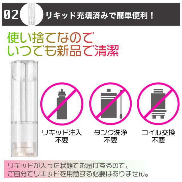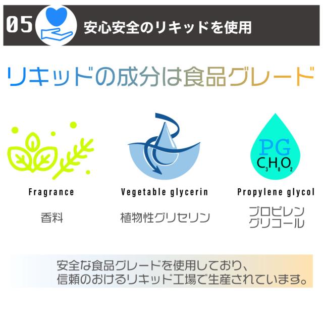 リキッドのメイン成分は天然植物性グリセリン、プロピレングリコール、香料と安全性に最大限配慮しており、当然ながらニコチンやタール等は一切含まれていません。また、本体は耐熱性に優れた食品級の樹脂素材でできており、液漏れを防ぐとともに危険な物質を摂取してしまう心配もありません。