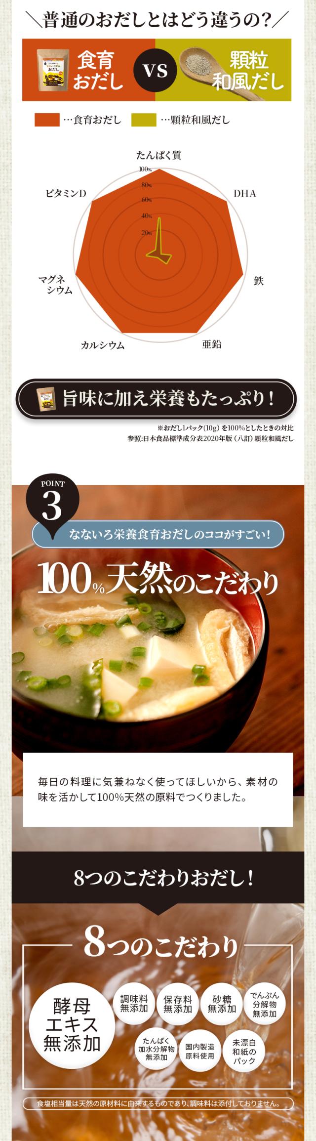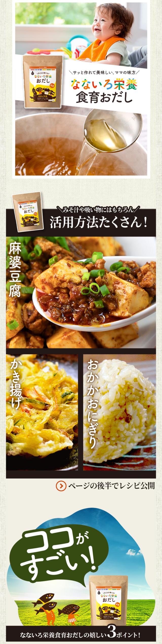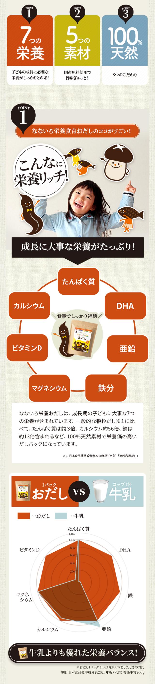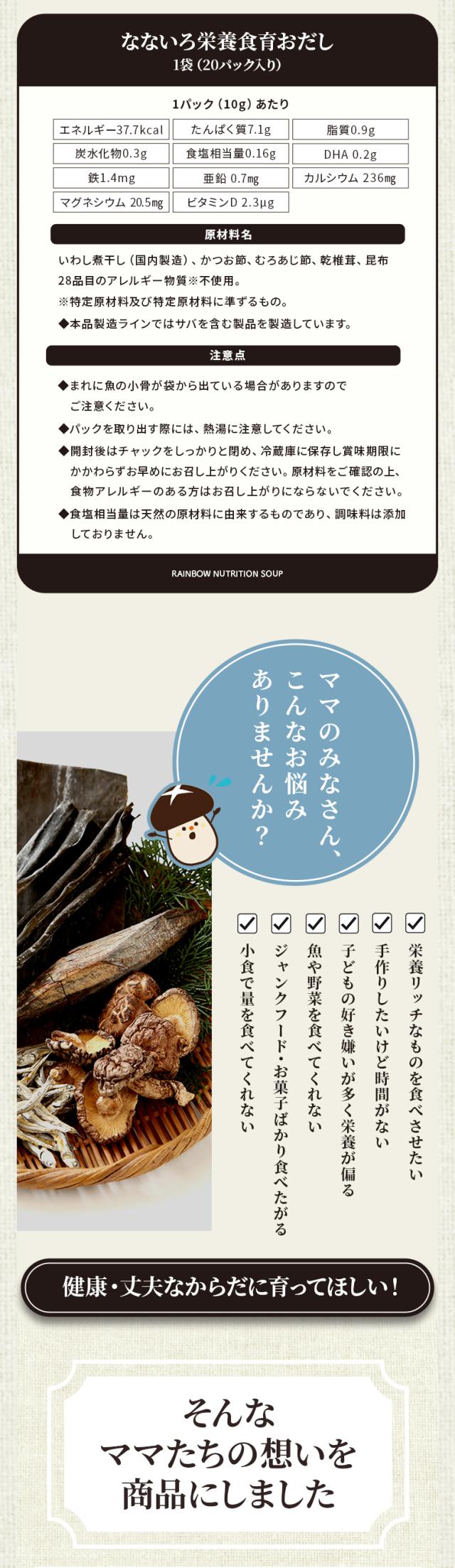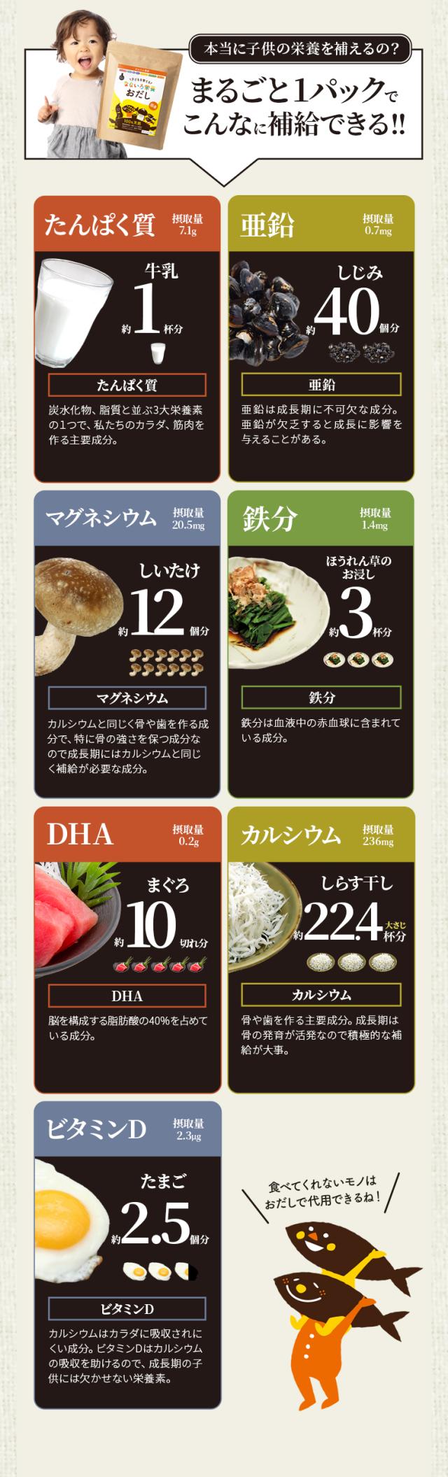 たんぱく質・DHA・鉄・亜鉛・カルシウム・マグネシウム・ビタミンDのなないろ栄養が入った子どもを育てる“食育おだし”
