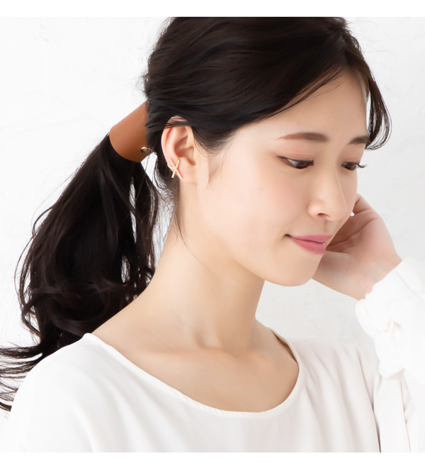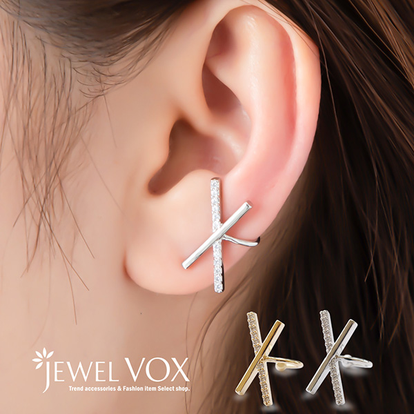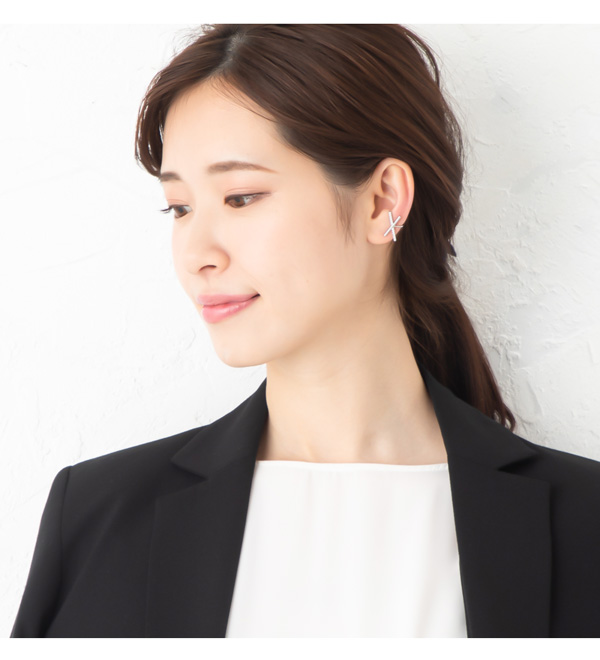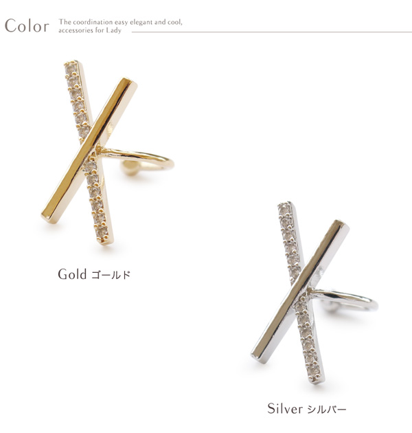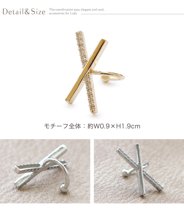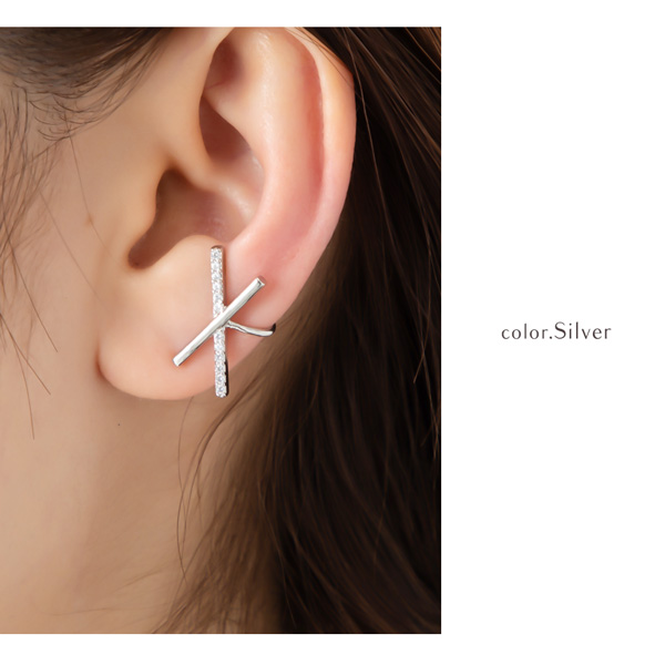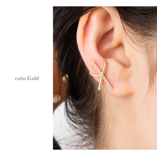 | 耳の上部と軟骨部分を挟むように引っ掛けるウェアリング(イヤーカフ)です。 煌めくキュービックジルコニアとメタルバーをクロスさせたスタイリッシュなデザイン。 耳元にアクセントを加えてくれる存在感と上品なフォルムでコーデを引き立ててくれます。 | |