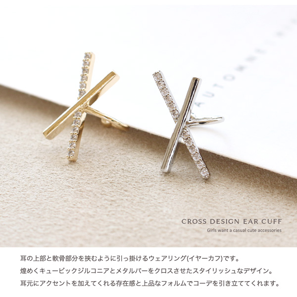 イヤーカフ 片耳用 イヤリング ウェアリング イヤークリップ キュービックジルコニア クロス 十字架 メタル ゴールド シルバー 金 銀 シンプル 重ねづけ 重ね付け 重ね着け デイリー レディース 女性