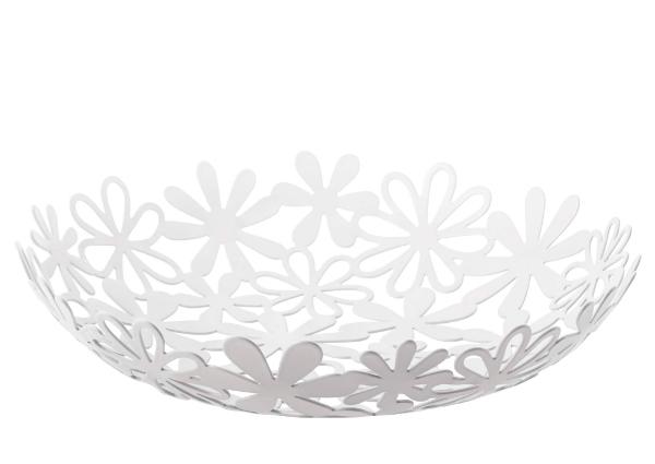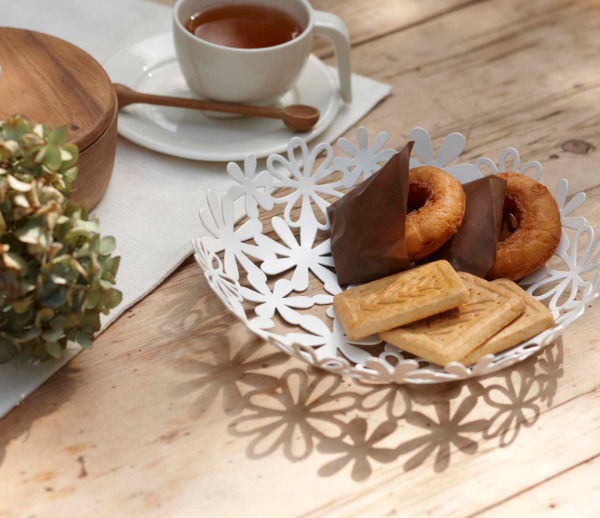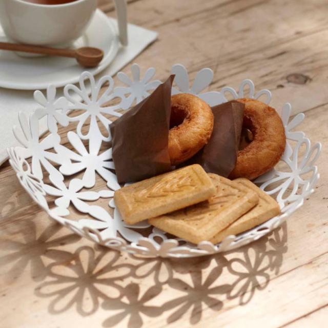 フラワーのデザインが華やかな、スチール製のバスケットSサイズです。シンプルなデザインなので、様々なインテリアに馴染みが良く、フルーツやスイーツを乗せてテーブルに出すだけで、パッと華やかな空間を演出できます。