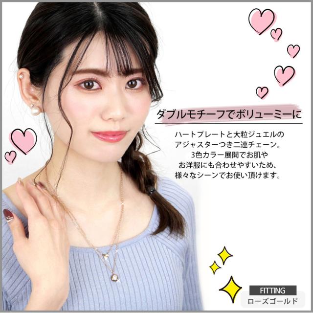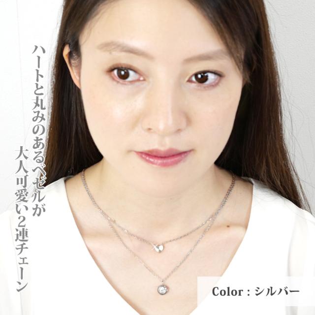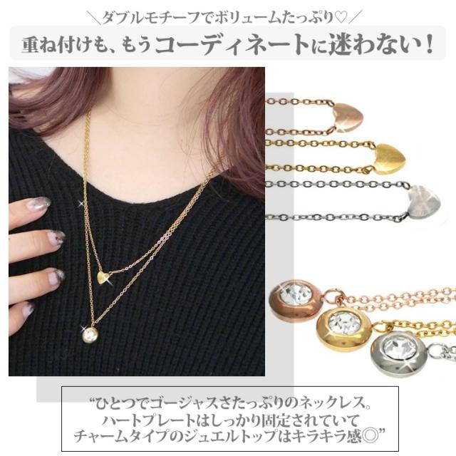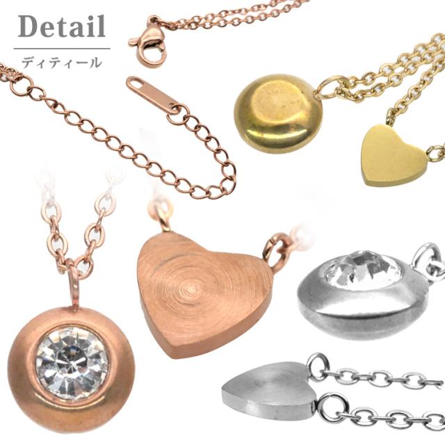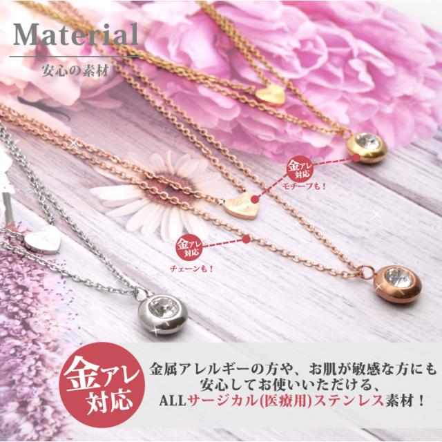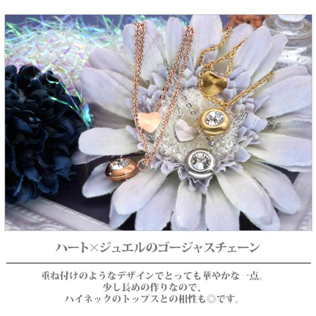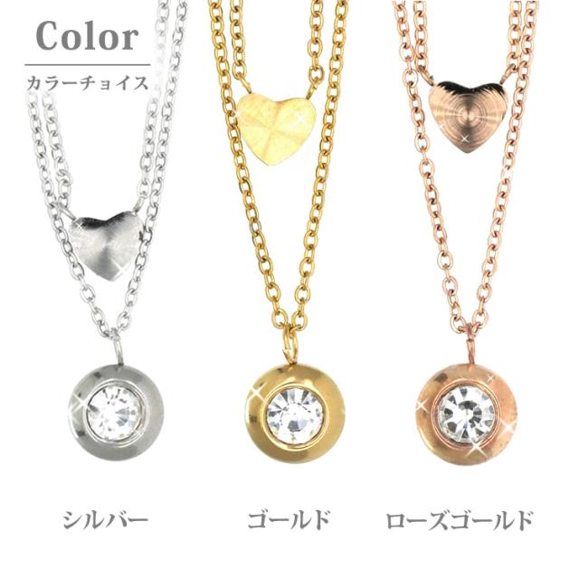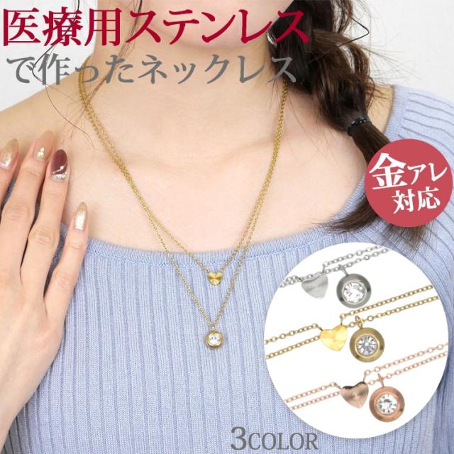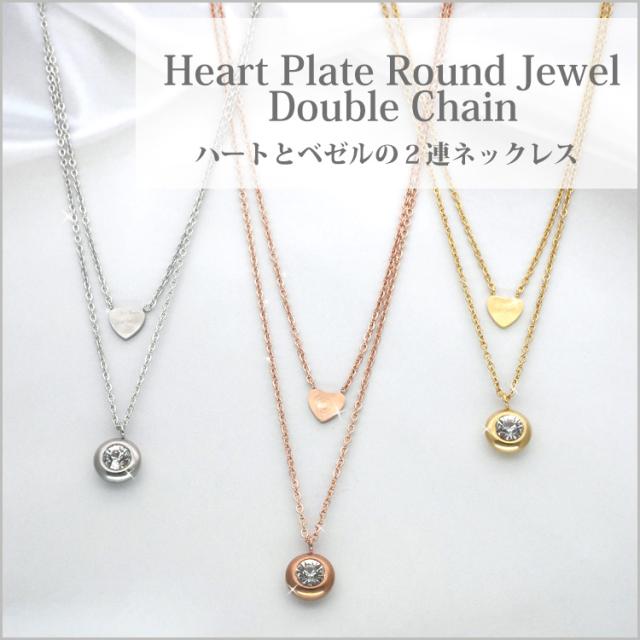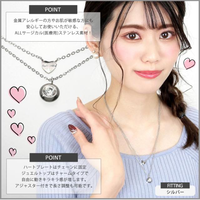 金属アレルギー対応 ステンレスペンダント ハートプレートアンドラウンドジュエルダブルチェーンネックレス ステンレスネックレス 安心 316L ニッケルフリー
