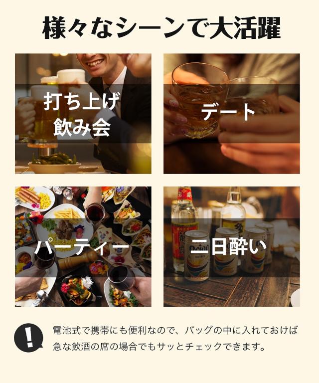 電池式で携帯にも便利なので、バッグの中に入れておけば急な飲酒の席の場合でもサッとチェックできます。