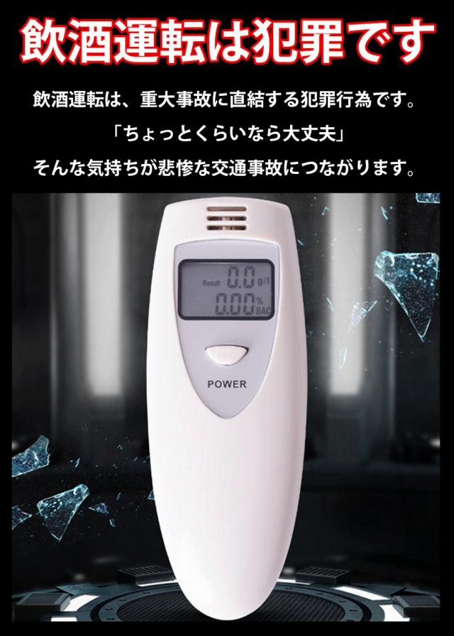 | 商品の説明 | 飲酒・酒気帯び運転防止に!息を吹きかけるだけ! 衛生的で簡単な呼気アルコールチェッカーです。 飲酒運転は、重大事故に直結する犯罪行為です。 事前に事故防止を心がけましょう。 携帯便利にも便利なので、バッグに入れてお出かけOK! お酒を呑んだあとにフーッと息を吹きかけるだけで簡単にチェック完了です。 電池式で携帯にも便利なので、バッグの中に入れておけば急な飲酒の席の場合でもサッとチェックできます。 ※アルコール検知気は、飲酒後や翌日などに、吐く息からアルコールが体内に残っているかを測定する機器なので、車などの運転前などに使用して、飲酒運転の可否を判定するものではありません。 あくまでもセルフチェックの為の機器ですので、正しくお使いください。 |