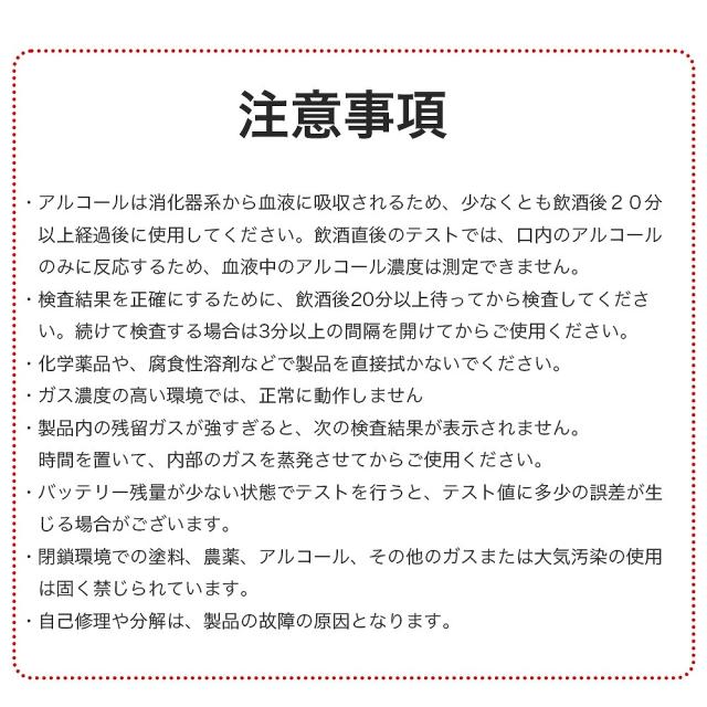 ※アルコール検知気は、飲酒後や翌日などに、吐く息からアルコールが体内に残っているかを測定する機器なので、車などの運転前などに使用して、飲酒運転の可否を判定するものではありません。