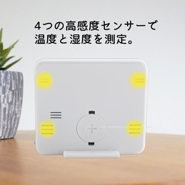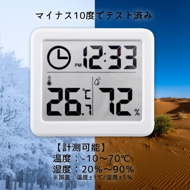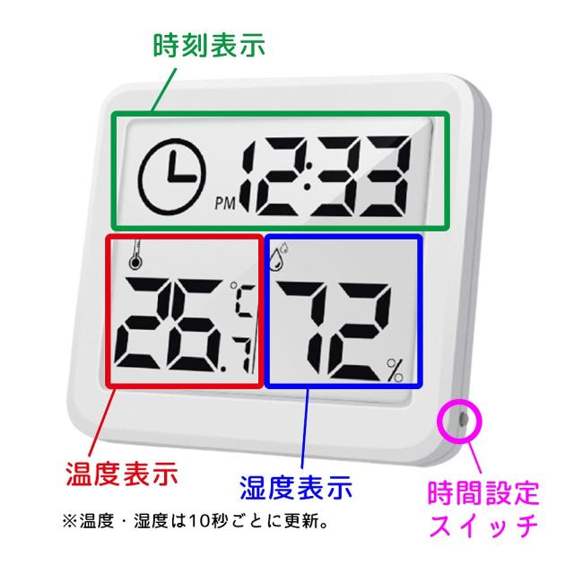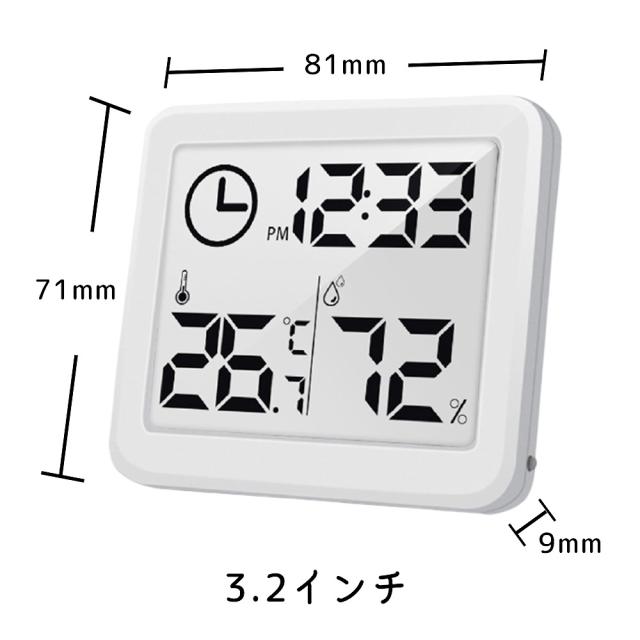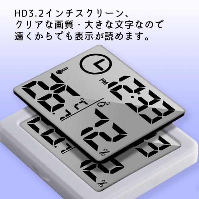 シンプルデザインの温湿度計■遠くからでも見やすいHD3.2インチのスクリーン■置き時計&壁時計置き時計→背面に部品を取り付け。壁用→両面テープをご使用ください。■時間・温度・湿度表示温度:-10〜70℃湿度:20%〜90%10秒ごとに計測※誤差:温度±1℃/湿度±5%RH◆表示:時刻・温度・湿度温度測定範囲:-10〜70℃温度測定精度:±1℃温度分解率:0.1℃湿度測定範囲:20%〜90%時刻12時間表示湿度測定精度:±5%RH湿度分解度:1%※温度・湿度は10秒ごとに計測■ボタン電池CR2032 3V使用■大きさ:3.2インチ/81mm×71mm×9mm■ご注意品質向上のため本製品は予告なくデザインや仕様を変更する場合がございます。ディスプレイ環境によって画像の商品イメージが実物と異なることがございます。本商品の利用による本体の破損、汚れ、および内部のデータ破損には一切保証いたしかねます。(※)仕様変更等でサイト上の画像とは若干デザインが変更されている場合がございます。また画面上と実物では、多少色具合が異なって見える場合がございます。※ 付属の電池は作動テスト用のため保証対象外となります。
