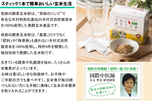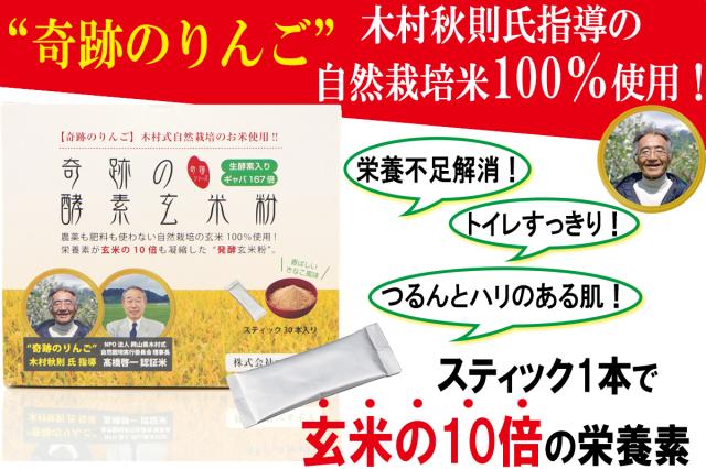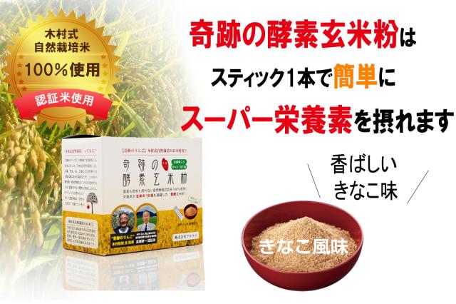 奇跡の酵素玄米粉は、“奇跡のリンゴ”で有名な木村秋則氏直伝の木村式自然栽培米を100%使用した発酵玄米食品です。