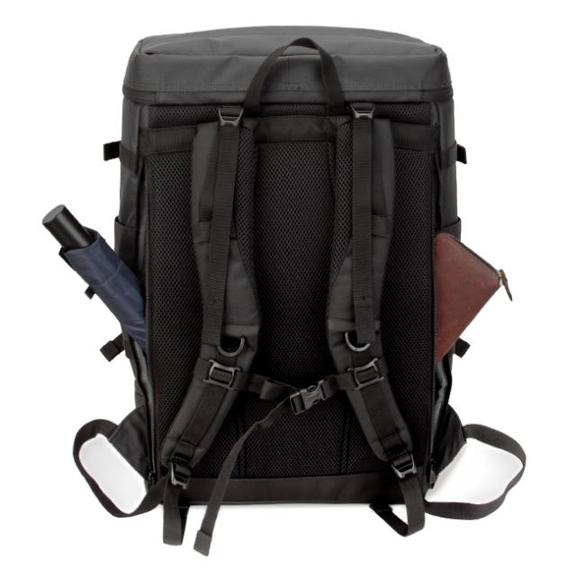 両サイドにも500mlペットボトルや折りたたみ傘などが入るポケットを搭載。