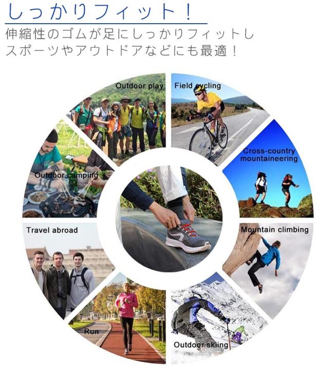 伸縮性のゴムが足にしっかりフィットし、スポーツやアウトドアなどにも最適!