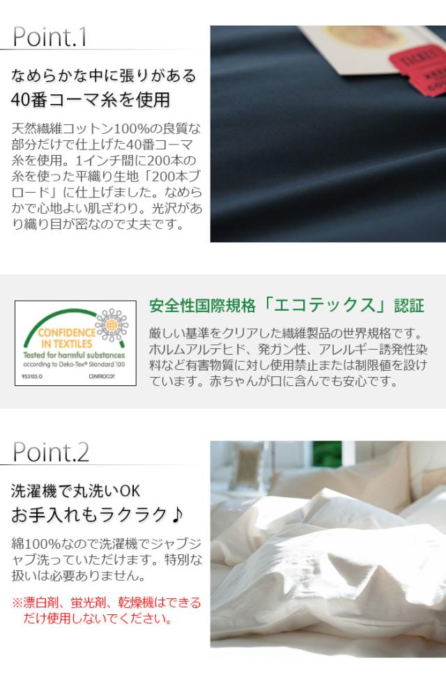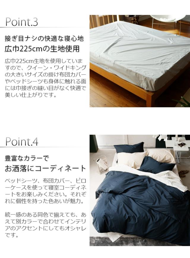 天然繊維コットン100%の40番コーマ糸を使用したベーシックな印象の寝具カバーです。なめらかな中に張りのある独特のさわり心地が魅力です。 チクチクせず静電気も起きにくいのでお肌にやさしいファブリックです。