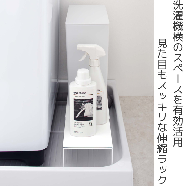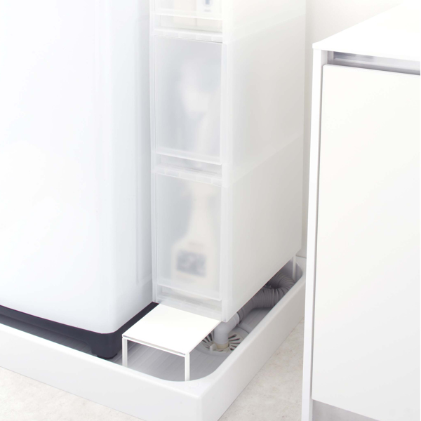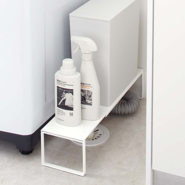 洗濯機まわりで目立たせたくない排水口とホースを隠しながら、その上の空きスペースを有効活用できる伸縮ラックです。防水パンに合わせてスライドさせるだけで隙間にフィットし、スッキリとした空間にしてくれます。