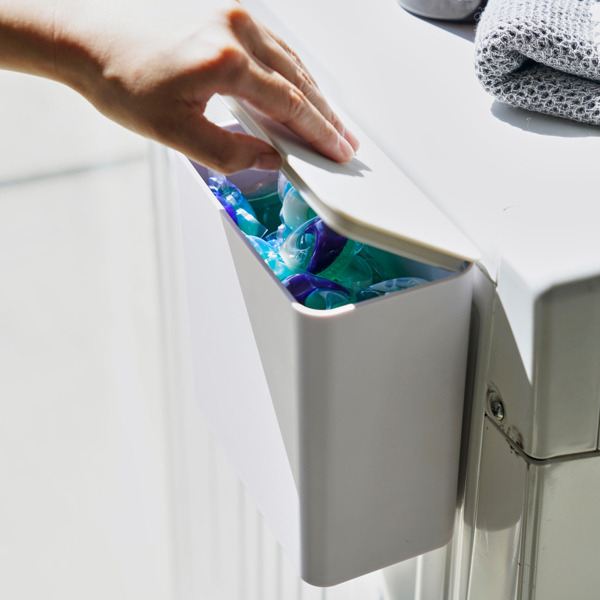 洗濯洗剤ボールを収納できるフタ付きストッカーです。収納スペースがなくても、洗濯機などの側面に磁石でピタッと付けるだけ。使いやすい場所にお好みの高さで簡単に取り付けできます。