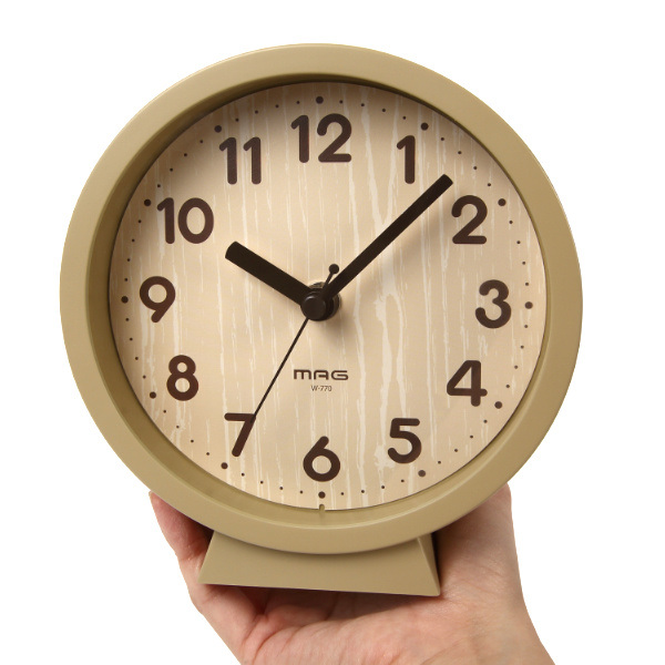木目調の文字板と落ち着いたカラーリングがおしゃれな置き時計です。ナチュラルな雰囲気なので、どんなお部屋にも馴染みます。