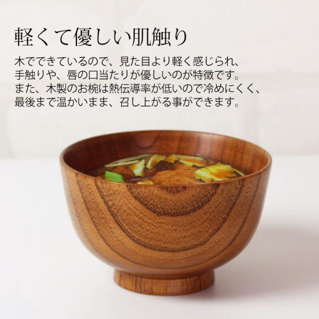 また、木製のお椀は熱伝導率が低いので冷めにくく、最後まで温かいまま、召し上がる事ができます。