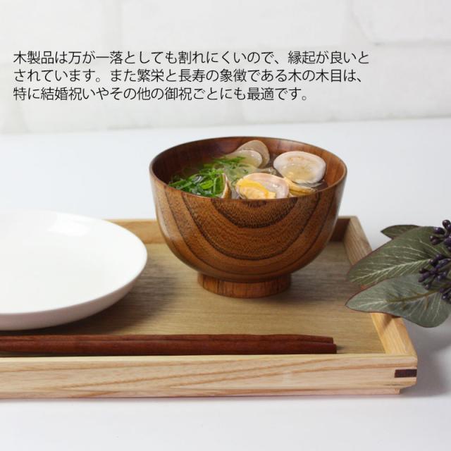 | 商品説明 | 木でできているので、見た目より軽く感じられ、手触りや、唇の口当たりが優しいのが特徴です。 また、木製のお椀は熱伝導率が低いので冷めにくく、最後まで温かいまま、召し上がる事ができます。 独特の木の感触も楽しめ、普段の食事も上質なものになります。 木製品は万が一落としても割れにくいので、縁起が良いとされています。 また繁栄と長寿の象徴である木の木目は、特に結婚祝いやその他の御祝ごとにも最適です。 |