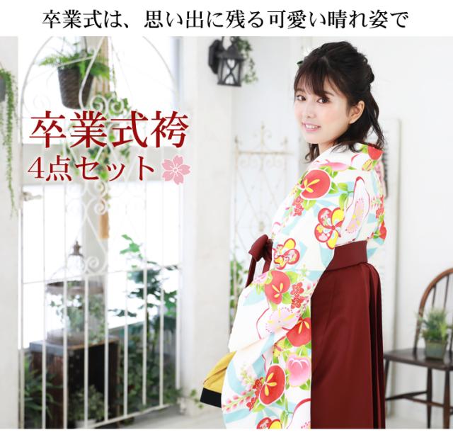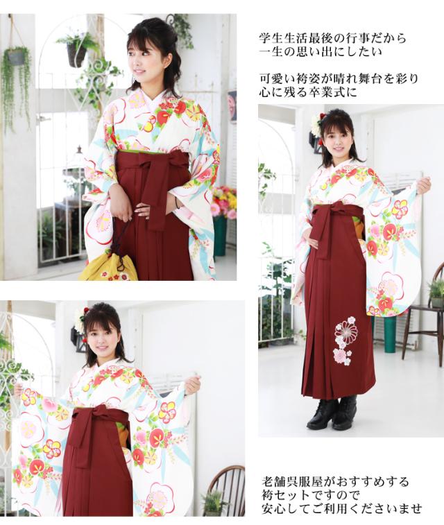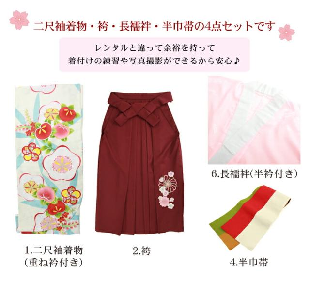 【販売】〔zu〕当店オリジナルデザイン 袴 セット 卒業式 女性 4点フルセット 購入 卒業式袴セット 2尺袖着物&袴「白地に梅と桃」レトロ 大学 販売 安い