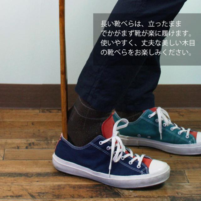 天然木から削り出した、長いロング靴べらです。長い靴べらは、立ったままでかがまず靴が楽に履けます。