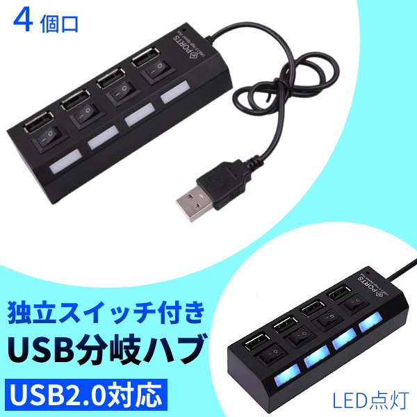 usbハブ スイッチ 4ポート 高速 充電ケーブル 拡張 増設 USB ハブ ケーブル 電源付き USB2.0 スイッチ付き LED点灯
