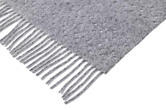 軽くて、やわらくて、暖かい。冬に欲しい条件をかなえるストールは、国内きっての毛織物の産地・尾州の宮田毛織工業が手掛けました。空気を多く含む糸作りにもこだわり、編み地を縮絨(しゅくじゅう)の加工することで、軽さと暖かさを実現。さらに、圧縮ウール生地の、ドットの穴とフリンジ部分は工程の中、緻密に計算され溶かして作る毛織物職人の技術です。ひとたび巻けば、そのぬくもりにずっと包まれていたくなるほど。そんな物語ごといとおしくなる一枚です。