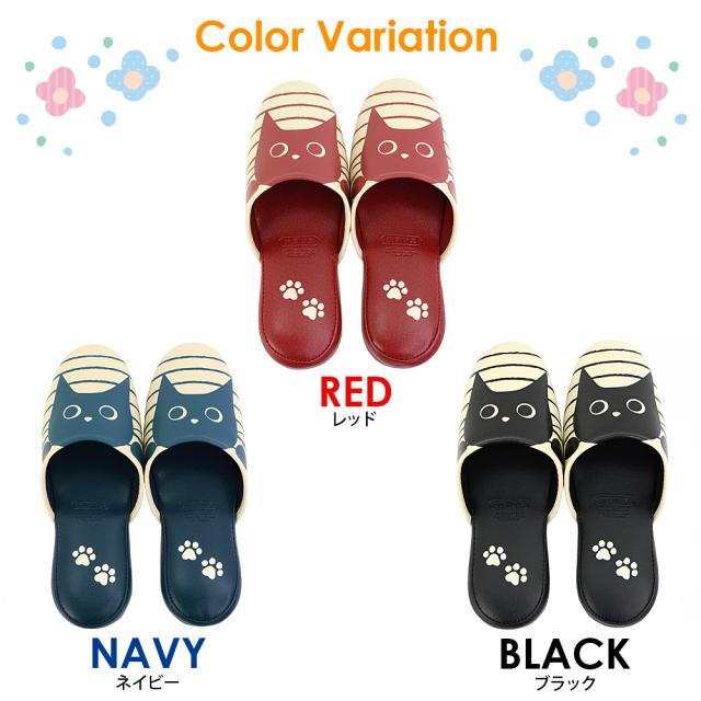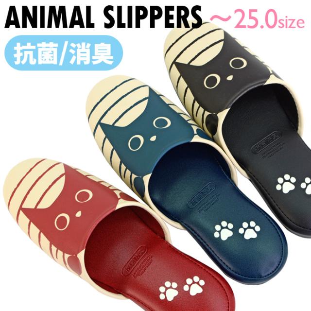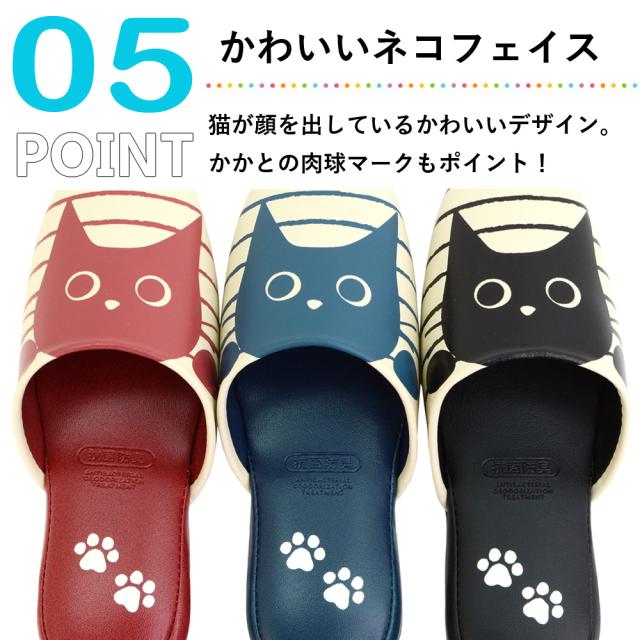ピョコンと顔を出すかわいいネコがプリントされた抗菌スリッパ。