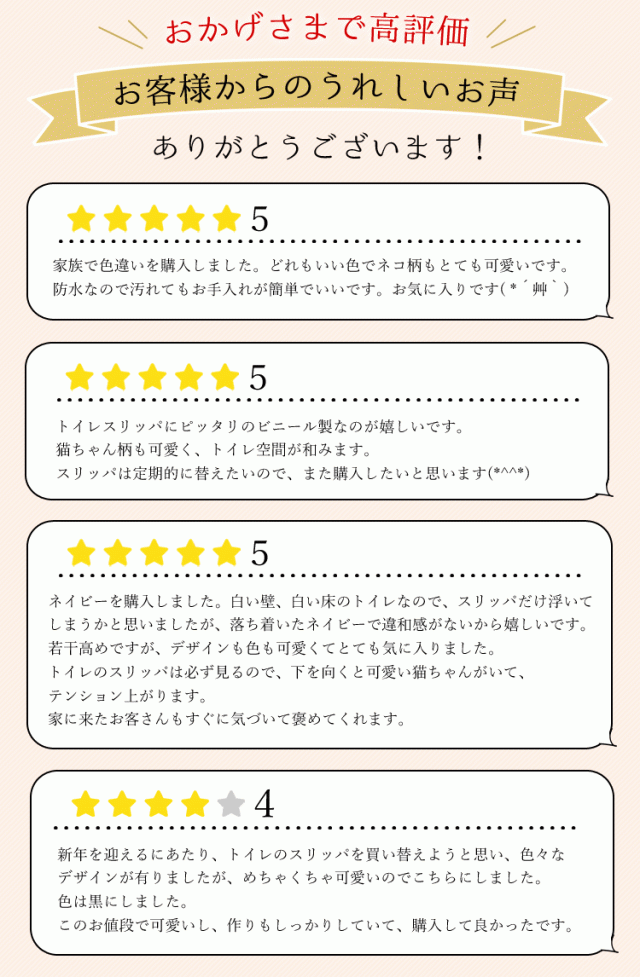 - トイレスリッパにピッタリのビニール製なのが嬉しいです。猫ちゃん柄も可愛く、トイレ空間が和みます。スリッパは定期的に替えたいので、また購入したいと思います(*^^*)