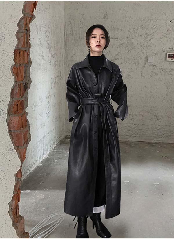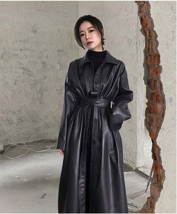 【送料無料】PU フェイクレザート レザージャケット ロングジャケット スプリングコート 革ジャン アウター レディース コート ロングコート 春アウター カジュアル ベルト付き