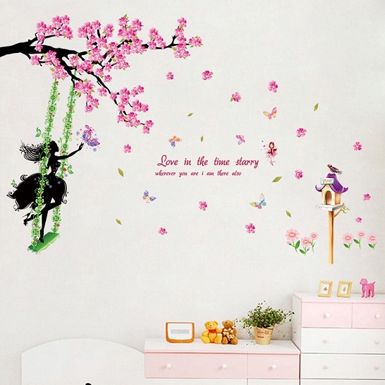 ウォールステッカー 桜とブランコに乗る妖精 蝶々 はがせる デコレーションシール 桃色の花の下 少女 春 郵便受け 殺風景な家 雰囲気変え