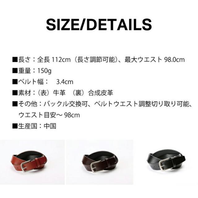 パーソンズジーンズのベルトがこの価格で登場! ブラック、ブラウン、チョコの3色展開です。 表面は牛革の特有のビジュアルで、ツヤのある質感です。 裏は合成皮革を使用して耐水性を高めています。 厚みのあるベルトでカジュアルにピッタリ! メンズでもレディースでもカッコよく決まる! シンプルな装飾なので、どんなボトムスでも相性抜群です。 長さ調節可能で、ウェスト98.0cmまで対応可能です。 シンプルデザインなので贈り物やプレゼントにもおすすめです。 - DETAIL - ■長さ:全長112cm(長さ調節可能)、最大ウエスト98.0cm ■重量:150g ■ベルト幅: 3.4cm ■素材:(表)牛革 (裏)合成皮革 ■その他:バックル交換可、ベルトウエスト調整切り取り可能、ウエスト目安〜98cm ■生産国:中国 【サイズ】 ベルト長さ:約112.0cm ベルト幅:3.4cm ベルトバックル交換:可能 ベルトウエスト調節:切取り可能 ベルトウエスト目安:切取り可能〜98cm(最長) 【サイズ表記について】 ベルト長さ:バックル先端から剣先までの長さ。 ベルトウエスト目安:ピンの根元から始めのピン穴〜最後のピン穴まで。 ※ご注意- ・革のキズなどについて 本商品には天然の革を使用しております。 その為「シワ・キズ・色むら・匂い・小さな汚れ」等がある場合があります。 これらは革本来の特性によるもので不良ではございません。 ・カラーについて 天然素材の為1点1点色味が異なる場合がございます。 ・縫製等について 本商品はハンドメイドで作られた商品の為、 縫製や留め具に微妙なズレがある場合がございます。 上記を予めご了承の上ご検討頂きます様お願い申しげます。 ●商品サイズ・カラーは、企画サイズとなります。 ●商品画像につきましては、モニターの種類・設定等により、実際の商品とは素材感や色味が異なる見え方をする場合があります。 ●商品仕様は、予告無く仕様変更される場合がございます。予めご了承下さい。 ●生地にわずかな織糸の縫いこみなどがある場合がありますが、目立つ程度ではございませんので予めご了承ください。 ●商品によっては、他店と在庫共有しているものがございますので、ご注文を頂戴した時点で、 在庫が確保できない商品につきましては、 ご注文をキャンセルさせていただく場合がございます。 なにとぞ、ご了承の程、よろしくお願いいたします。 |