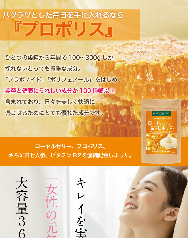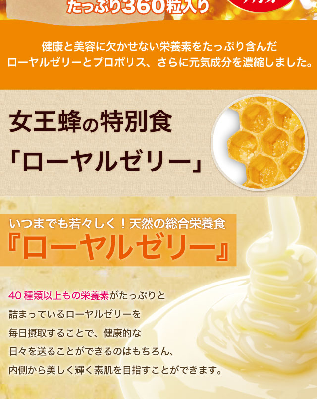 40種類以上もの栄養素がたっぷりと詰まっているローヤルゼリーとプロポリスを毎日たっぷり摂取