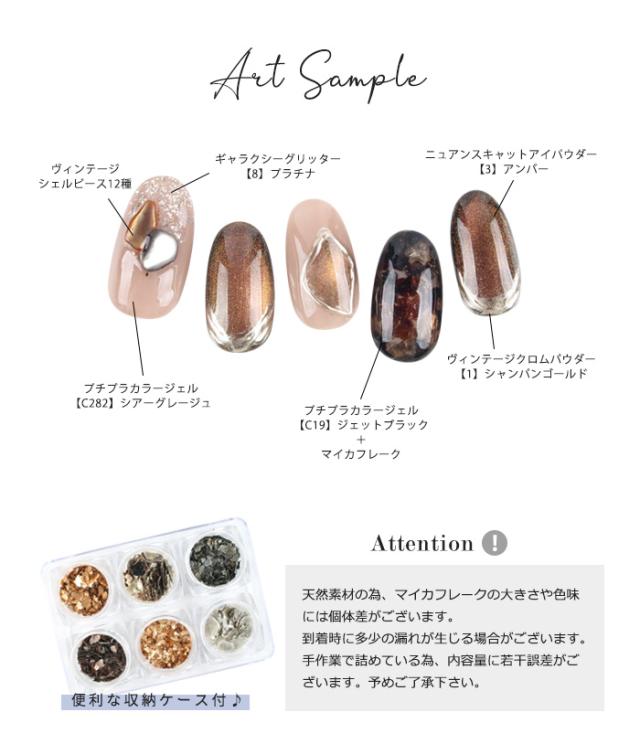 | 作例チップ使用アイテム | プチプラカラージェルシアーカラーシリーズ【282】シアーグレージュ プチプラカラージェル【C19】ジェットブラック ギャラクシーグリッター【8】プラチナ ニュアンスキャットアイパウダー【3】アンバー ヴィンテージクロムパウダー【1】シャンパンゴールド ヴィンテージシェルピース12種 |
