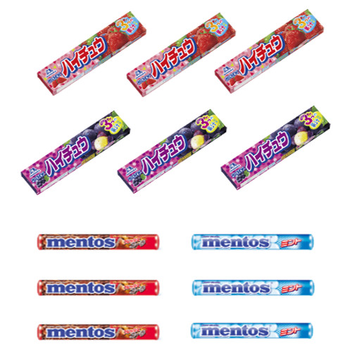 ハイチュウ<ストロベリー>×3コ、ハイチュウ<グレープ>×3コ、メントス<コーラ>×3コ、メントス<ミント>×3コ