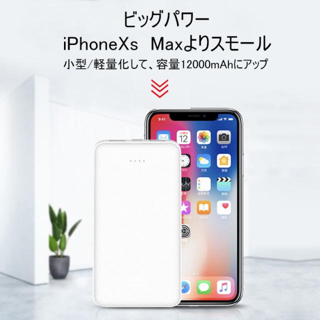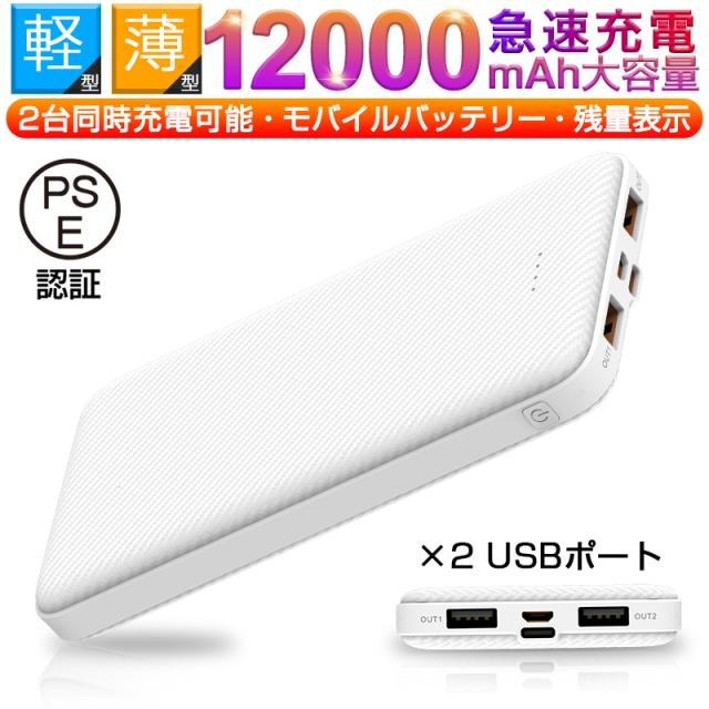 モバイルバッテリー スマホ充電器 12000mAh大容量 小型 残電量表示 2台同時充電 iPhone、iPad、Android各種対応 PSE認証済