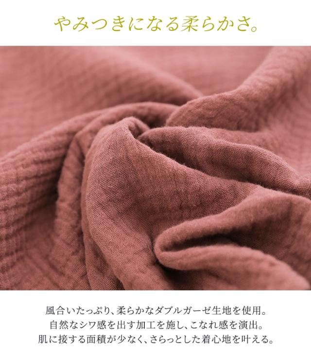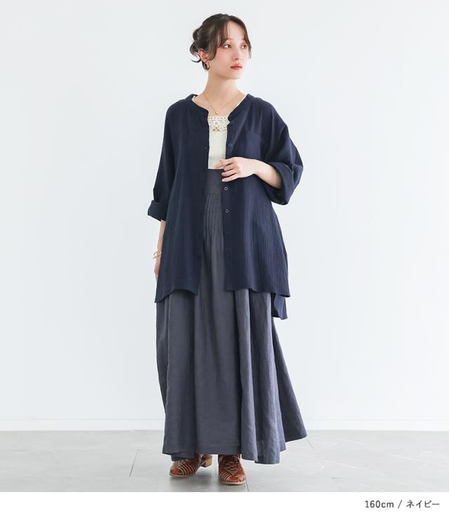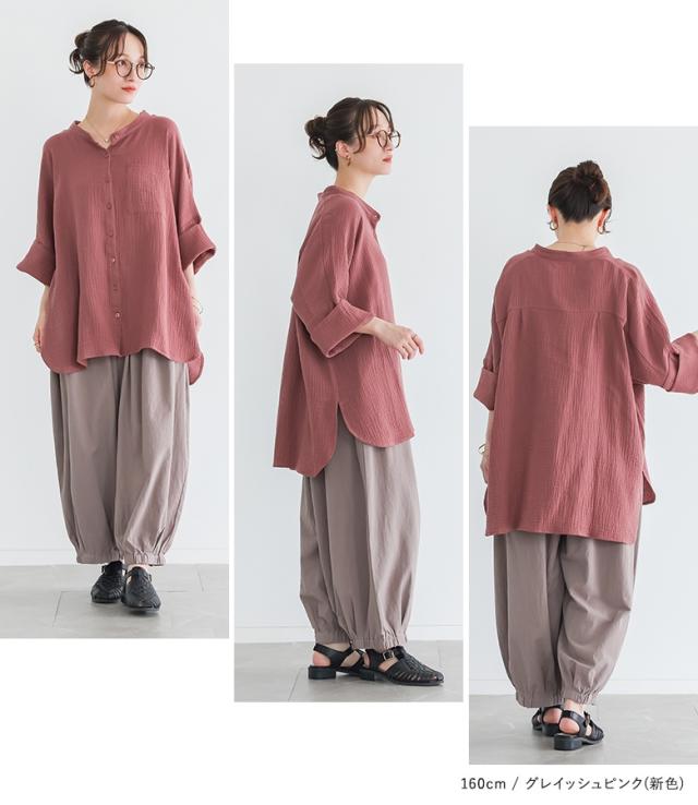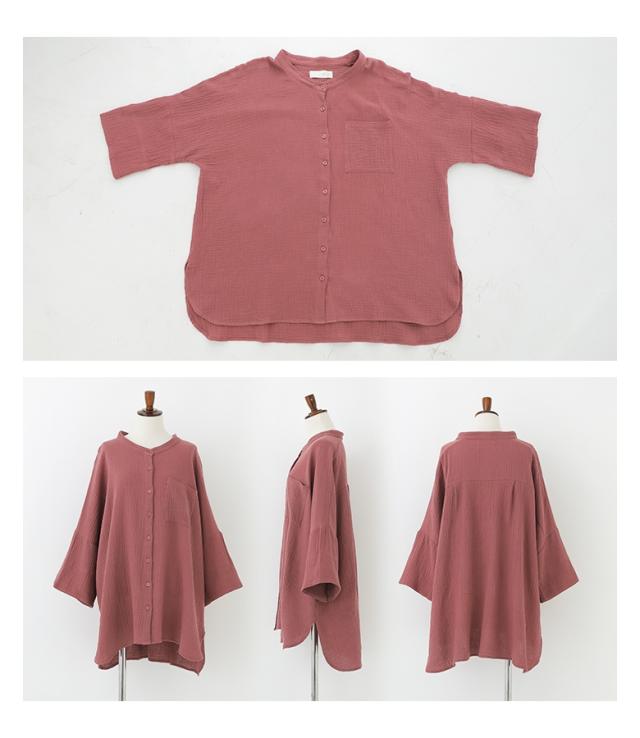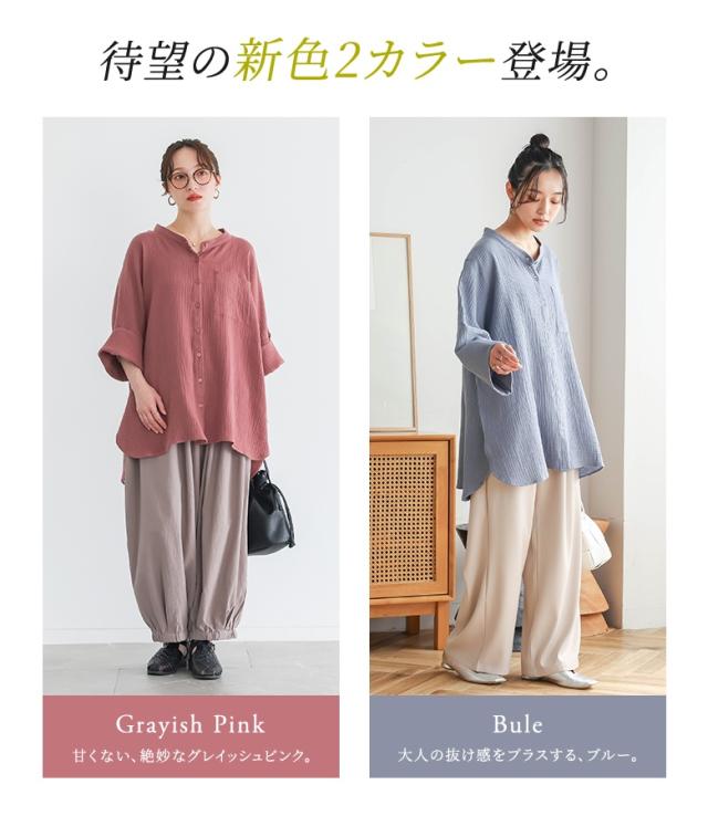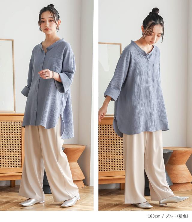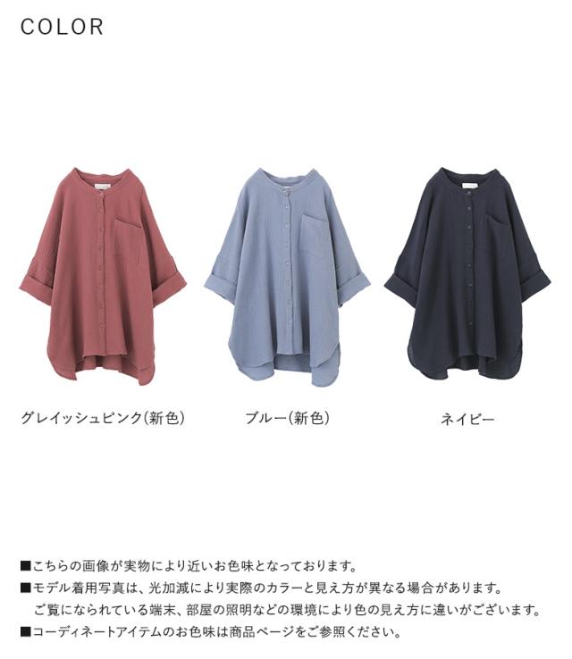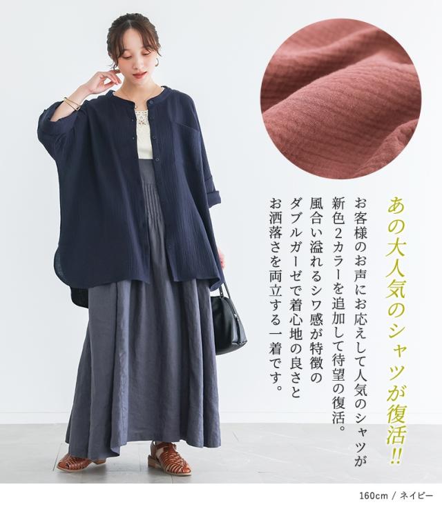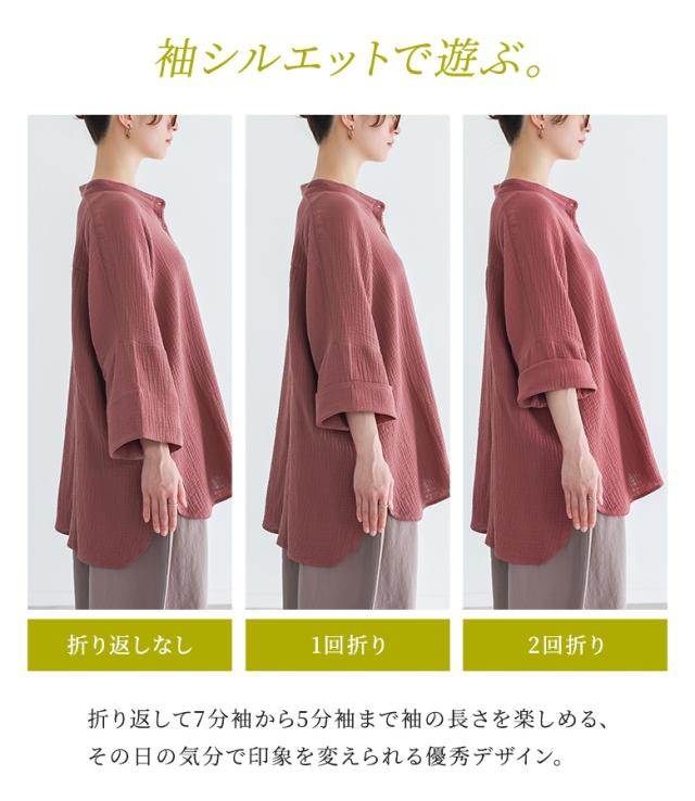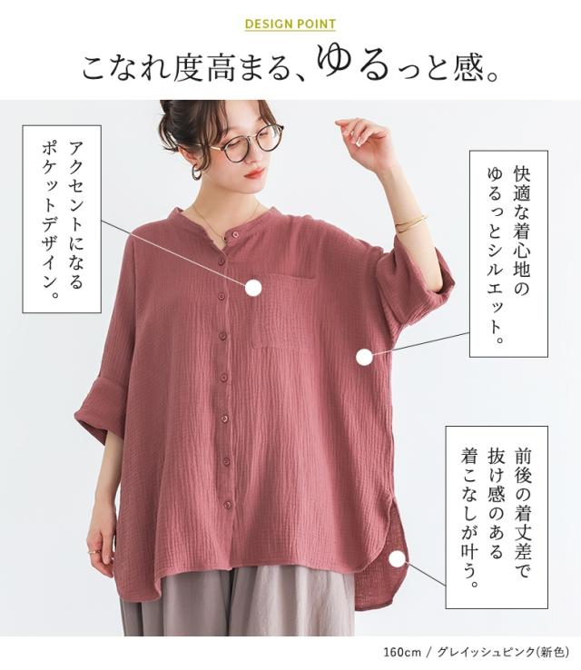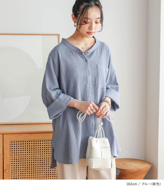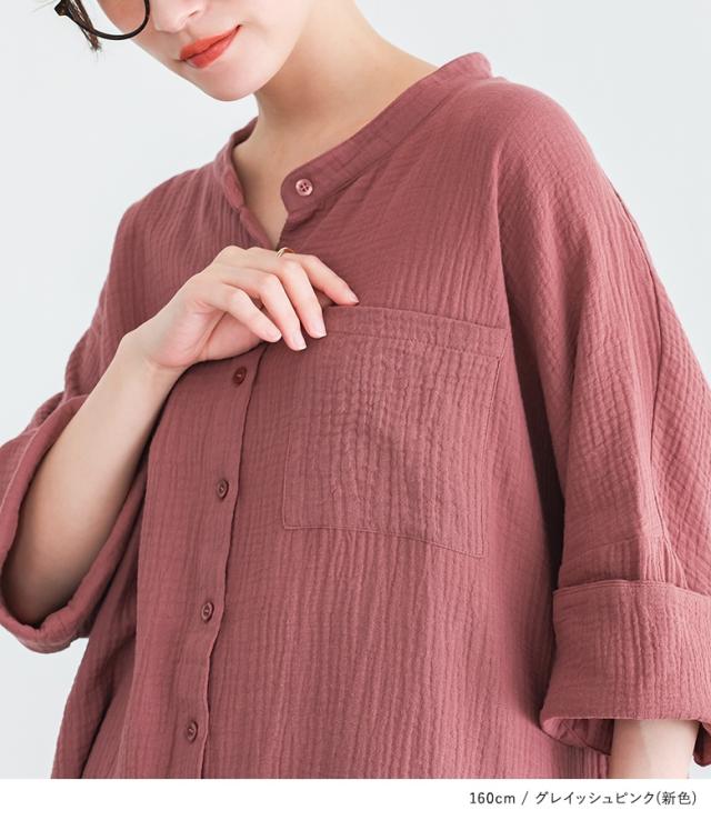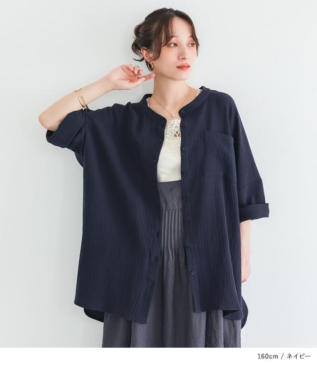 【新色登場】『ダブルガーゼバンドカラーシャツ』【メール便不可】【20】[シャツ レディース 春 夏 トップス 五分袖 七分袖 半袖 ブラウス バンドカラー ダブルガーゼ コットン混 シワ加工 薄手 体型カバー 二の腕カバー]