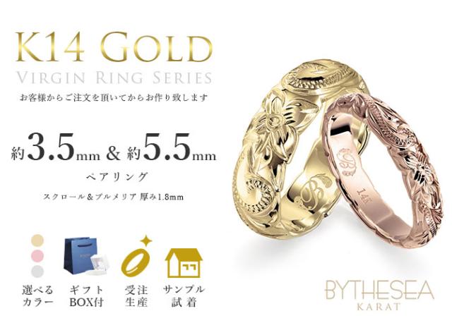 ハワイアンジュエリー K14 ヴァージンペアリング カットアウト 約3.5mm幅&約5.5mm幅 結婚指輪