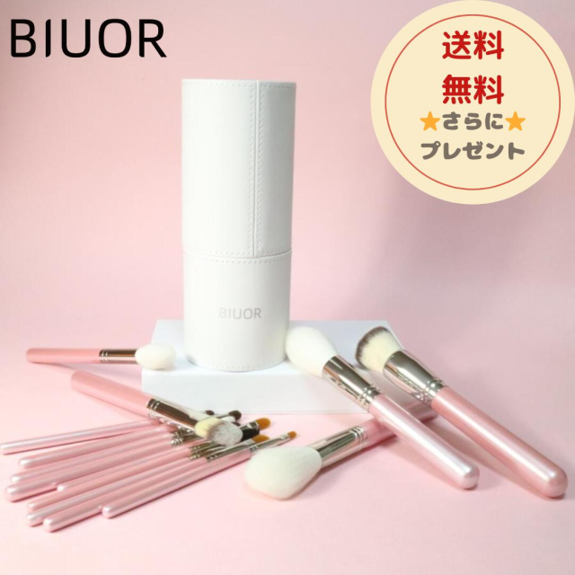 【送料無料】 BIUOR 天然毛 14本メイクブラシセット アイシャドウ ファンデーションブラシ化粧筆 高級タクロン プレゼント 毛量たっぷり 超柔らかい 専用ポーチ付 収納 携帯 ピンクパール バレンタインプレゼント