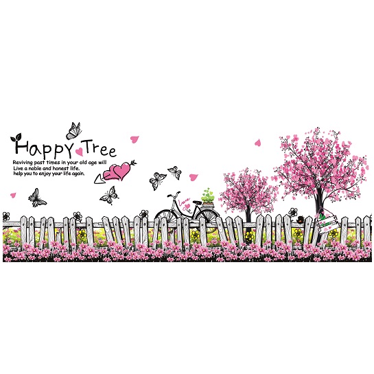 ウォールステッカー ハッピーツリー 幸せの木 壁に貼る シール かわいい 自転車と桃色の庭風景 ハート 蝶 女の子 足元 窓やテレビの下