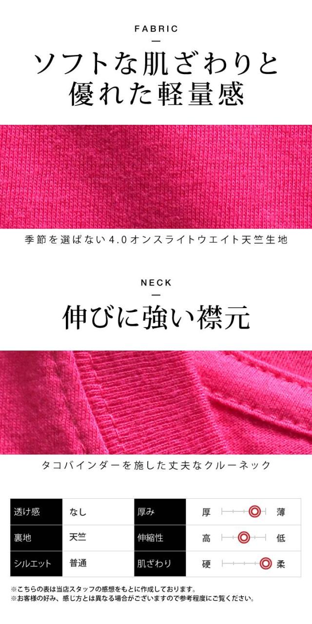 素材はシーズンを問わず活躍してくれるライトウエイト天竺生地。ソフトな肌触りと軽量感に優れた4.0oz。
