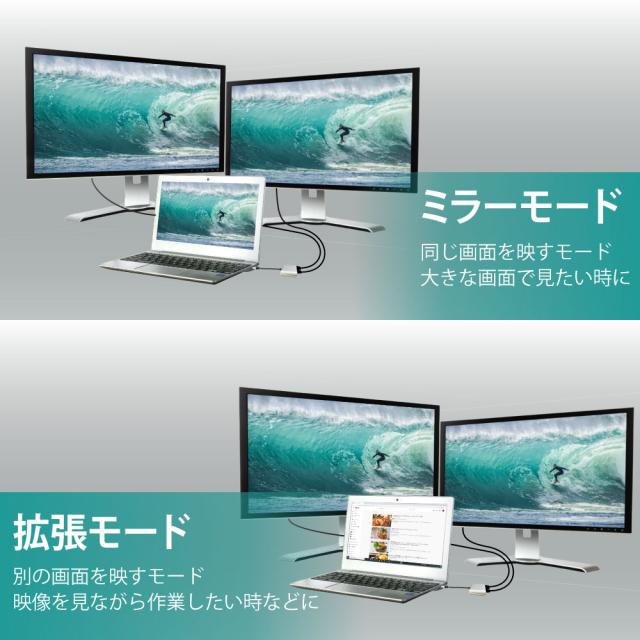 別の変換アダプタを買わず、1つのUSB 3.0ポートからVGAと HDMI2つの方式を同時に変換できます。