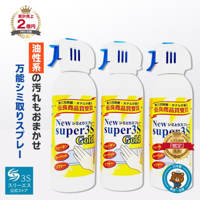 カーペットクリーナー 汚れ落とし 油性汚れに対応! New Super3S GOLDタイプ (240ml/3本セット) お部屋 絨毯 ソファ マット [日本のホテル・旅館100選] 優良商品 (業務用) 強力 洗浄 油汚れ 油性 ペン クレヨンの汚れ 絨毯クリーナー シミ消し シミ取り 染み抜き 洗剤